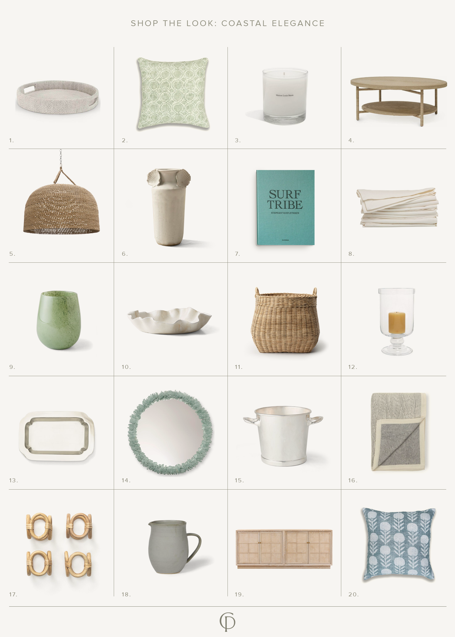 1. Round Rope Tray 2. Green Pillow 3. Candle 4. Seagrass Coffee Table 5. Woven Rattan Pendant 6. Seaside Vase 7. Surf Tribe Book 8. Linen Napkins 9. Handblown Green Vessel 10. Decorative Bowl 11. Woven Basket 12. Footed Hurricane 13. Silver Tray 14. Seaglass Mirror 15. Silver Champagne Bucket 16. Alpaca Throw 17. Rattan Napkin Rings 18. Ceramic Pitcher 19. Sideboard 20. Blue Pillow